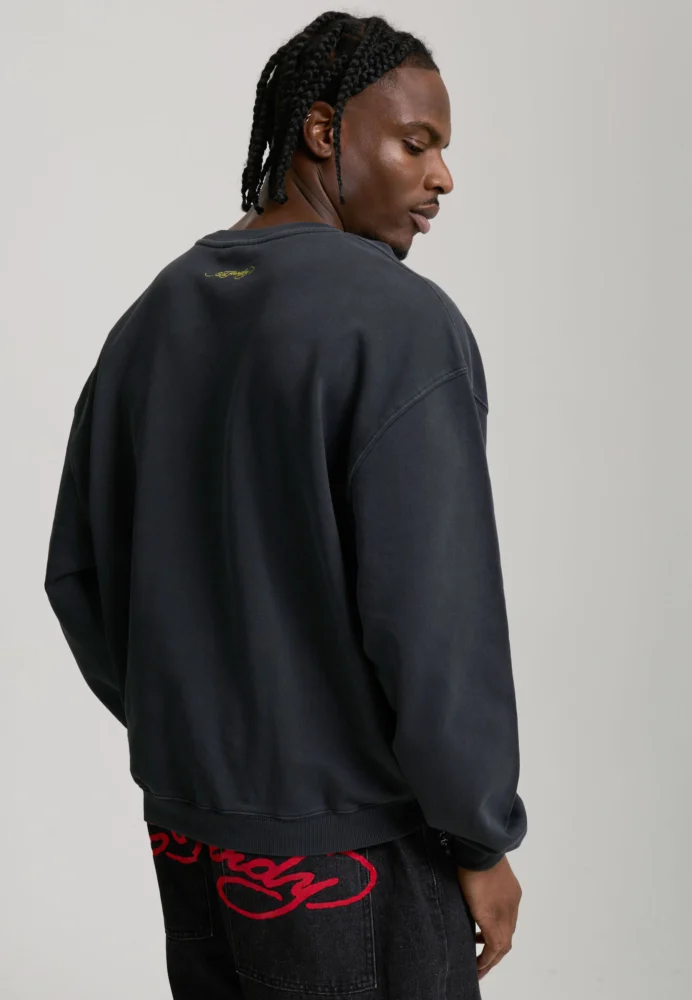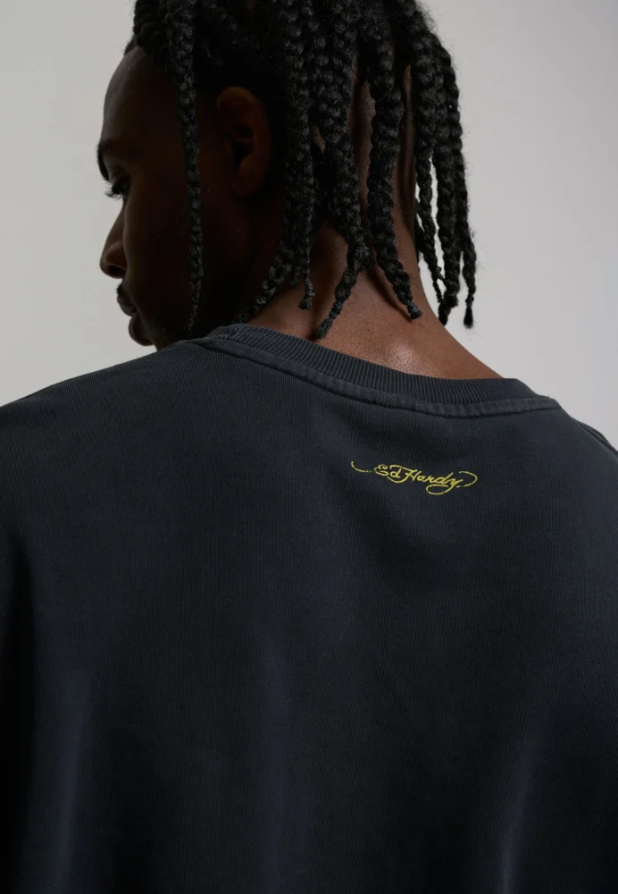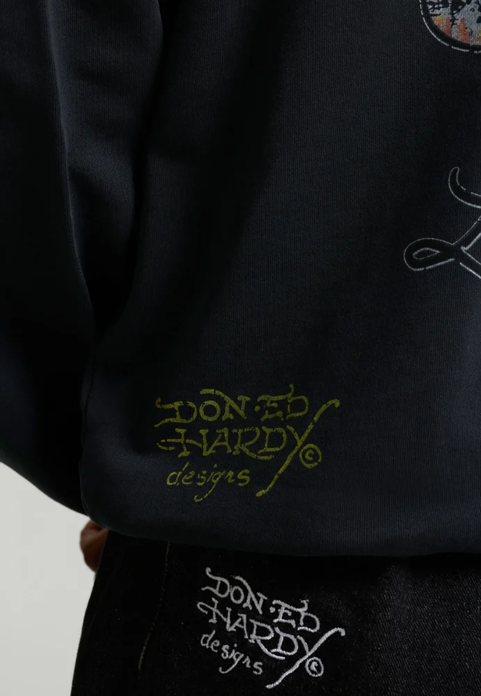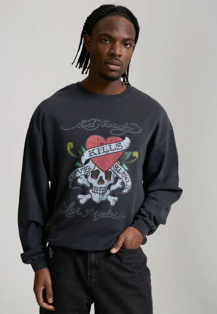 With its black base colour with bold, crimson Ed Hardy signatures and intricate, distressed “LOVE KILLS SLOWLY” skull and heart tattoo design, this vintage-wash crew-neck sweater is an absolute attention-grabber.